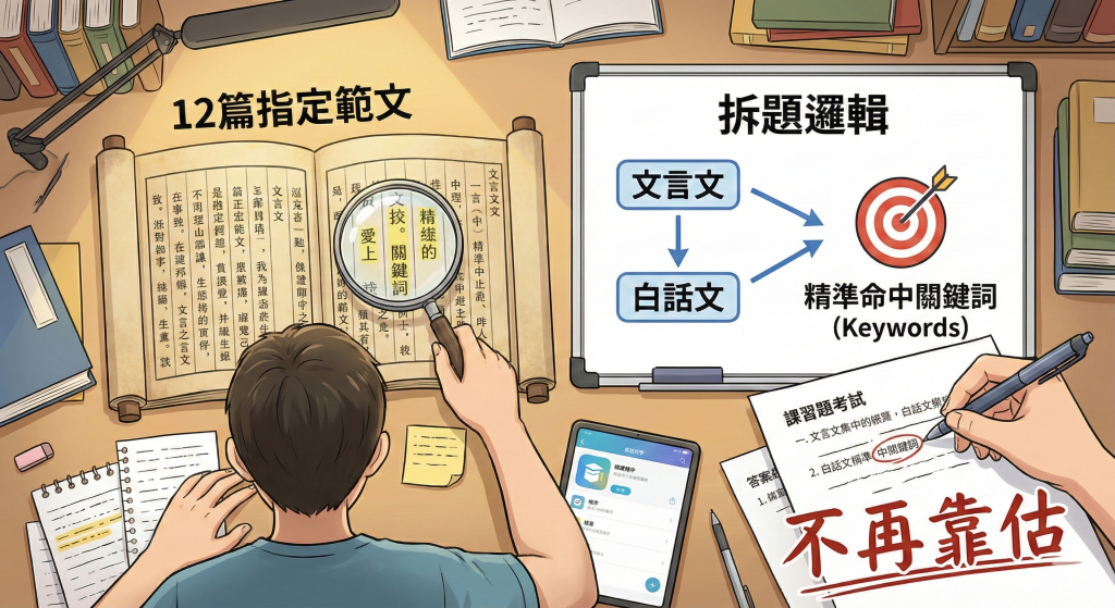 12 篇指定範文逐字精讀,配合課外文言文與白話文的「拆題邏輯」,教你精準命中答題關鍵詞 (Keywords),不再靠估。