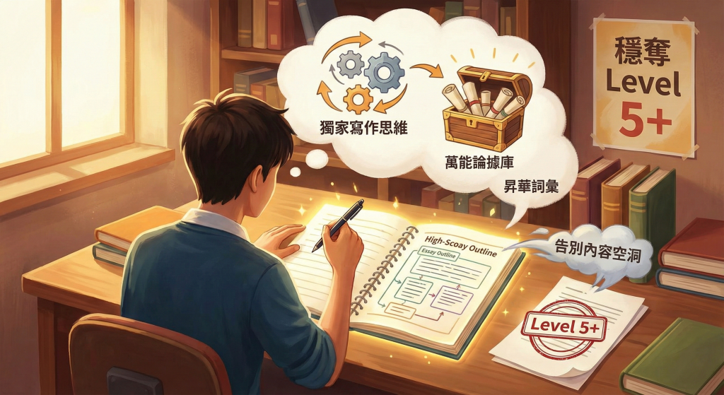 告別內容空洞。傳授獨家寫作思維、萬能論據庫與昇華詞彙,助你輕鬆構思高分大綱,穩奪 Level 5+。