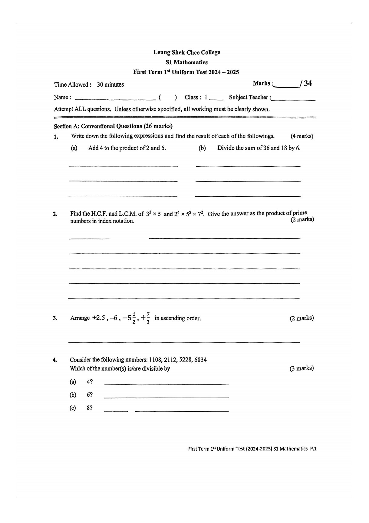 如何免費下載這份試卷(Leung Shek Chee College S1 Mathematics 24-25 First Term)?